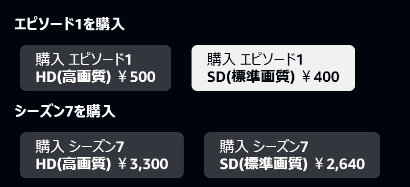 Amazonプライムではシーズン6は1話300円~、シーズン7は1話400円~となっています。(以下画像はシーズン7の情報)