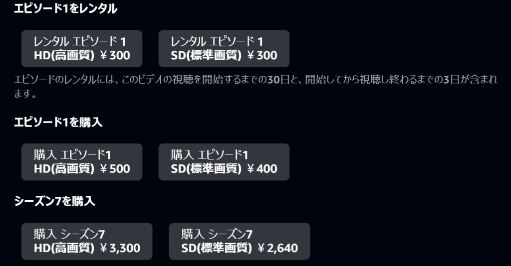 Amazonプライムではシーズン6、7ともに、1話300円~となっています。(以下画像はシーズン7の情報)